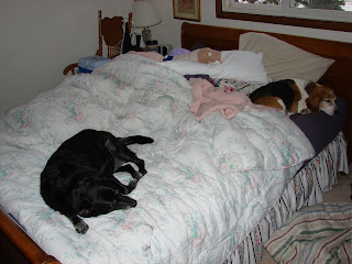 Really...I am in there...in bed under all the covers. That's my girl doggies; Molly, 8 yr old beagle and Lucy, 11 yr old Aussie Kelpie. They were so loyal during my bed rest, never leaving my side.