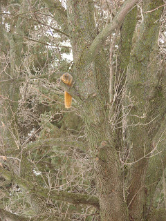 This morning I went out to fill the feeder with seed, corn and peanuts. There I found a beautiful red squirrel. She was large with a big bushy tail. She filled her little cheeks with feed and walked off to the nearest tree. There she sat for the longest time, munching on feed.