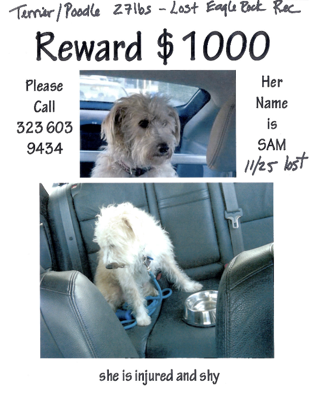 ReplyDelete12/7/09 - We've had sightings of our lost dog Sammy near San Pascual Stables in South Pasadena and also Occidental College in Highland Park/Eagle Rock (Zip codes 90041/90042) in the past week, but we still haven't found her. Please keep an eye out in South Pasadena, Highland Park & Eagle Rock.